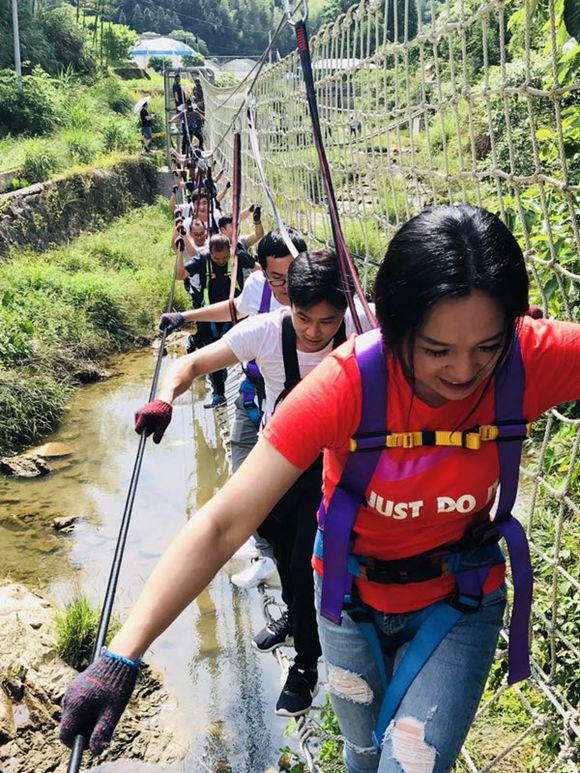 利山峽谷穿越戶外拓展項目線路全長1000米,離水面平均高度2米,沿溪逆流而上。全程共設(shè)16個關(guān)卡,許多關(guān)卡頗具挑戰(zhàn)性,特別考驗參與者的毅力、耐心和團隊協(xié)作精神。項目體驗過程中, 名隊員齊心協(xié)力,即使遇到舉步維艱的關(guān)卡,隊員們也不拋棄、不放棄,相互鼓勵,努力挑戰(zhàn)、超越自己。在精力和體力即將消耗殆盡之際,隊員們終于迎來勝利的曙光,終點處五顏六色的輪胎就像一只只甜甜圈,讓通關(guān)的勇者們品嘗了“苦盡甘來”的勝利滋味。