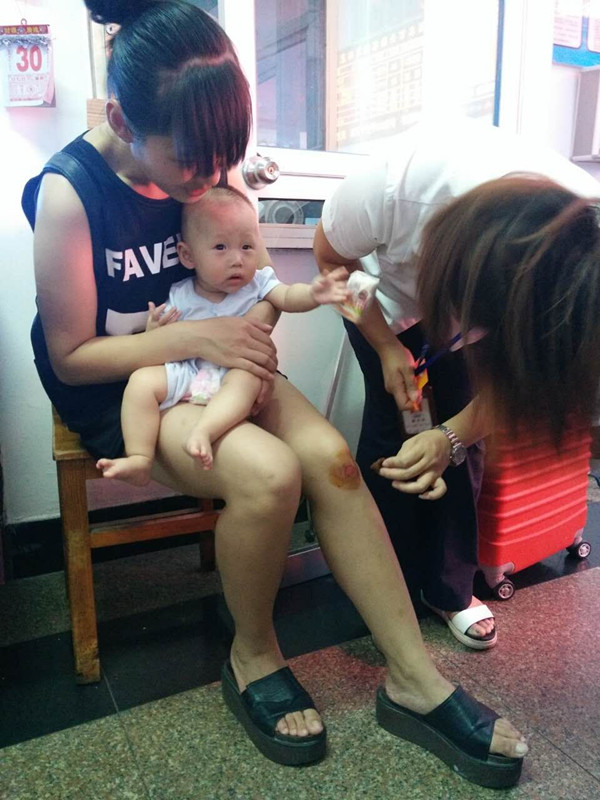 王月梅趕緊扶起了這位媽媽,并接過了她手里的寶寶,一邊哄著受驚嚇的寶寶,一邊幫忙收拾好散落的衣物,然后扶著年輕媽媽來到服務(wù)處的椅子上坐下。已經(jīng)身為人母的王月梅,對哄寶寶這種事已經(jīng)是輕車熟路了,不一會,寶寶就被哄笑了。寶寶沒事了她又馬上從服務(wù)處的醫(yī)藥箱內(nèi)找出碘伏、棉花、藥水,小心翼翼地為她消毒、上藥。