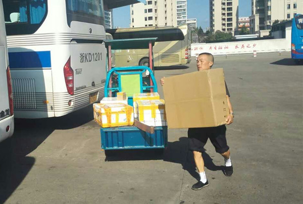 8月8日下午兩點(diǎn),今天的天氣預(yù)報(bào)最高溫度是36℃,可是室外溫度依然高的可怕。東站行李房外,一輛永康班車迎面駛來(lái),54歲的裝卸工胡瑞華立刻推著手推車迎了上去。車停穩(wěn)后,車上旅客紛紛下車跑向陰涼處,。對(duì)大部分人來(lái)說(shuō),這種太陽(yáng)下面站著都吃不消更別說(shuō)干活了。可是,胡瑞華在太陽(yáng)底下一件又一件地卸貨,認(rèn)真干好本職工作沒(méi)有一絲怨言。今天貨有點(diǎn)多,卸了滿滿一車,好在胡瑞華技術(shù)嫻熟,不一會(huì)兒就卸完了,推著車走進(jìn)行李房。雖說(shuō)只有幾分鐘的功夫,但胡瑞華已是滿頭大汗。車推進(jìn)行李房后,他對(duì)著電扇吹了幾下又接著開(kāi)始安檢理貨入庫(kù)的工作了。