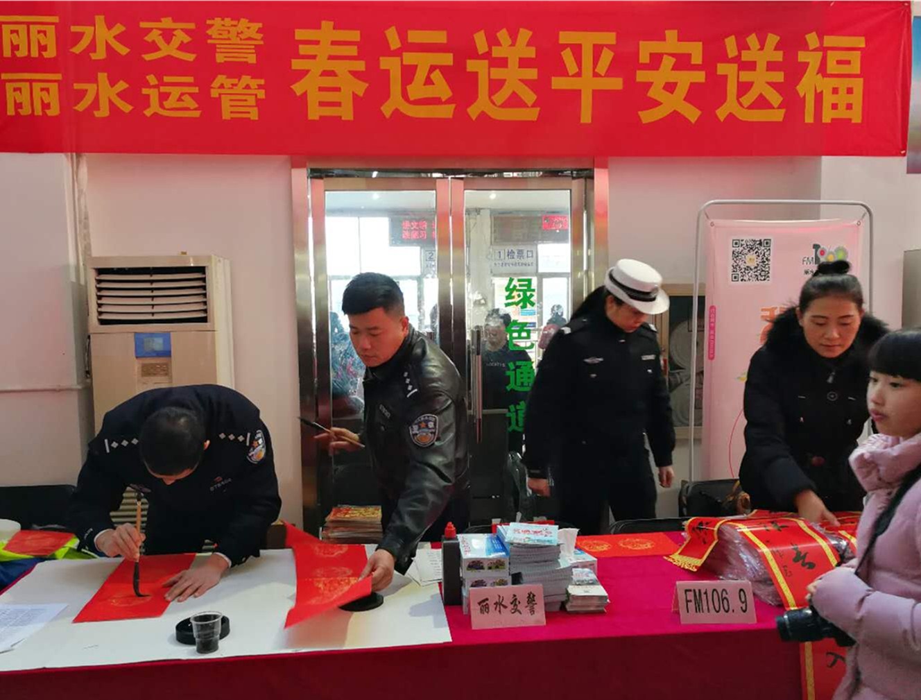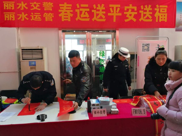 麗水交警、麗水運(yùn)管攜手麗水郵政的同志們給廣大旅客送來了新年的祝福,他們給旅客準(zhǔn)備了承載著祝福的福袋,提筆為旅客寫下一幅幅承載著吉祥、平安的春聯(lián),為2018年的春運(yùn)啟動(dòng)增添了喜慶的氣氛。