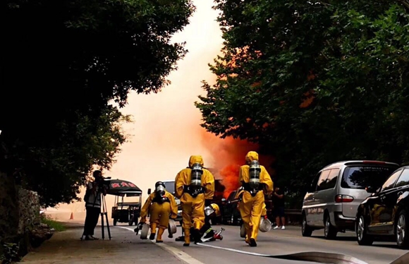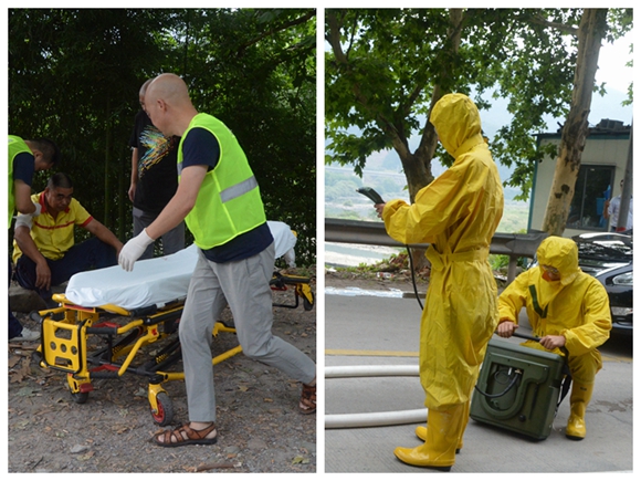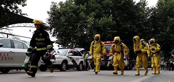 120趕到救治傷員、環(huán)保監(jiān)測(cè)人員進(jìn)行現(xiàn)場(chǎng)監(jiān)測(cè)