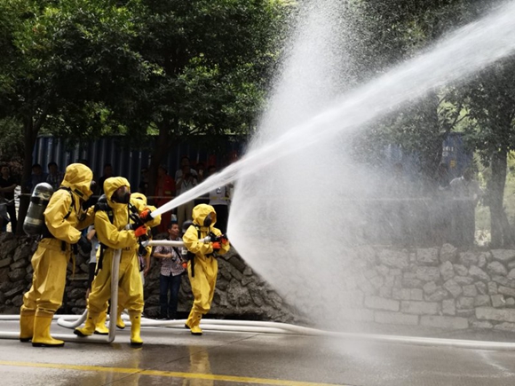 演練模擬一輛大客車(chē)在危險(xiǎn)品運(yùn)輸罐車(chē)事故路段受阻,面對(duì)危險(xiǎn)品泄漏爆炸危險(xiǎn),道路運(yùn)輸工作人員立即組織乘客撤離危險(xiǎn)區(qū)域,及時(shí)上報(bào)險(xiǎn)情并采取安全處置措施,等待交警、消防員、醫(yī)護(hù)和環(huán)保測(cè)評(píng)等人員趕赴現(xiàn)場(chǎng)處理的過(guò)程。短短10多分鐘,20個(gè)場(chǎng)景的演練科目流程一氣呵成。演練場(chǎng)景驚險(xiǎn)逼真,扣人心弦,贏得了在場(chǎng)觀演人員和群眾的一致好評(píng)。