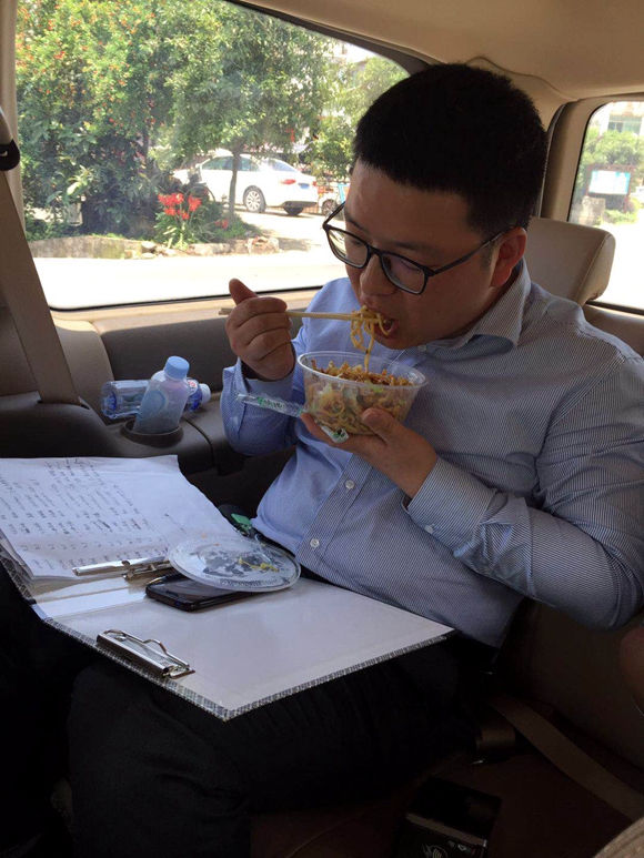 時間在忙而有序中過了飯點,注重細(xì)節(jié)的他,卻無暇顧及了自己的午飯,還是身邊的同事提醒到吃飯了,他才想起了這個茬。沒見他收拾收拾準(zhǔn)備下班,而是一頭鉆進(jìn)了車后座,端起了一碗早已冷卻的外賣炒面,扒拉了起來,眼睛卻一直離不開懷里的工作簿。同事打趣地說:勇哥,今天上班賺了加班費,還吃的這么省?。恳鹨黄逍Α哂绿痤^笑了笑,“冷面好吃!我得趕緊吃完,客人還等著我送發(fā)票呢!”