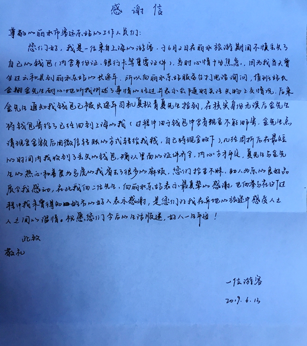 6月16日,東站服務(wù)臺(tái)收到了一封來(lái)自上海的感謝信。信中署名為一位游客的失主在信中向值班站長(zhǎng)金翔和駕駛員夏松青及東站的工作人員表達(dá)了感激之情。