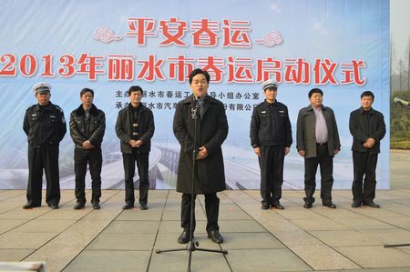 1月25日早上8:45分,“2013年麗水市平安春運(yùn)啟動(dòng)儀式”在西站舉行。麗水市副市長(zhǎng)葛學(xué)斌、市交通運(yùn)輸局局長(zhǎng)葉沙平、副局長(zhǎng)沈利文、集團(tuán)公司黨委書(shū)記、董事長(zhǎng)陳建敏、總經(jīng)理薛和有,以及市公安局交警支隊(duì)、高速交警麗水支隊(duì)、市公路局路政支隊(duì)、市運(yùn)管運(yùn)政支隊(duì)和集團(tuán)公司相關(guān)單位人員出席了啟動(dòng)儀式。儀式由麗水市政府副秘書(shū)長(zhǎng)姚志強(qiáng)主持。葛學(xué)斌副市長(zhǎng)、春運(yùn)領(lǐng)導(dǎo)小組組長(zhǎng)宣布2013年春運(yùn)全面啟動(dòng)。