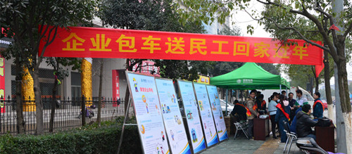為確保民工回家之路走得更順利,1月7日,在麗水開發(fā)區(qū)舉行的“民工服務(wù)月”中,處州晚報(bào)、麗水市總工會(huì)和麗汽集團(tuán)聯(lián)合推出“企業(yè)包車送民工回家”活動(dòng),向民工朋友發(fā)放了100多份“企業(yè)包車送民工回家”宣傳資料,現(xiàn)場(chǎng)辦理企業(yè)包車、拼車和散票購(gòu)票業(yè)務(wù)。