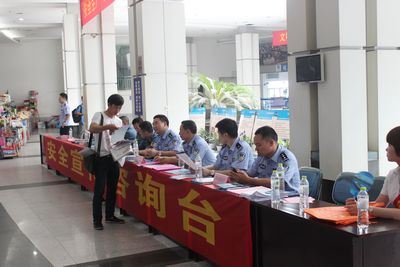 活動現(xiàn)場懸掛了安全生產(chǎn)宣傳標語,設(shè)置了安全咨詢臺,并在候車室前廳、中廳等人員聚集的位置,放置了各類以安全為主題的宣傳版畫,圖文并茂的向旅客宣傳了防詐騙、交通、防恐等安全知識。在整個活動期間,到咨詢臺來現(xiàn)場咨詢的旅客絡(luò)繹不絕,各單位咨詢?nèi)藛T還向旅客發(fā)放了《平安交通 人人有責(zé)》、《警民相約 共建和諧》、《公民防范恐怖襲擊手冊》、《為防范與遏制“電信(網(wǎng)絡(luò))詐騙犯罪”致市民的一封信》等十余種安全生產(chǎn)宣傳資料共計2000余份,營造了安全生產(chǎn)月活動的良好氛圍。