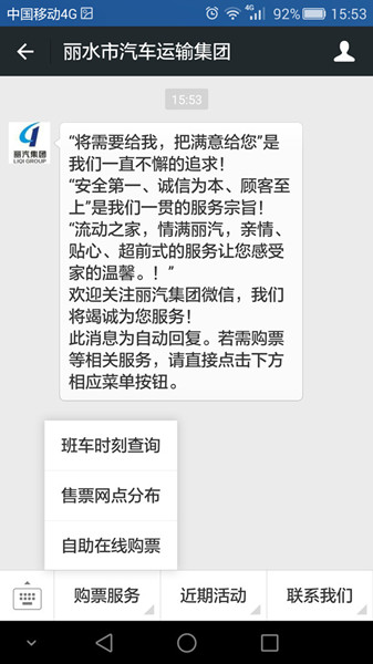 假期將至,為滿足旅客多樣化的購票需求,現(xiàn)旅客只需關(guān)注“麗汽集團(tuán)”微信公眾號(hào),就能實(shí)現(xiàn)通過手機(jī)終端直接購買從東、西汽車站始發(fā)班線的車票,還可以退票。