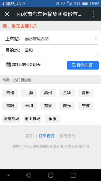 (3)點(diǎn)擊“購票”,進(jìn)入購買服務(wù)頁面,在上車站位置選擇“麗水客運(yùn)東站”或“麗水客運(yùn)西站”。
