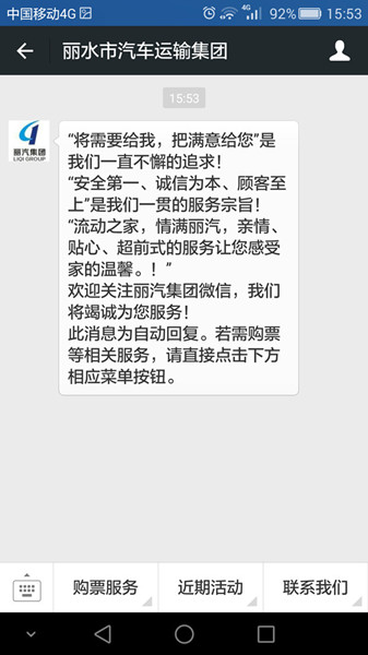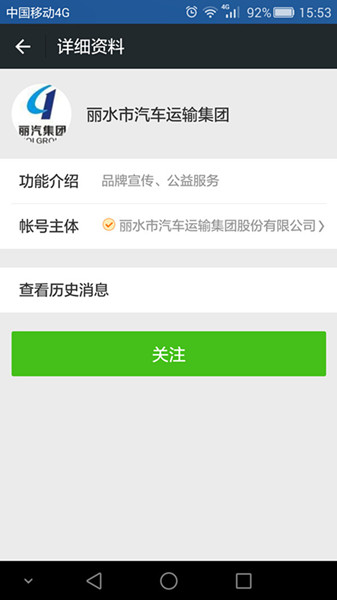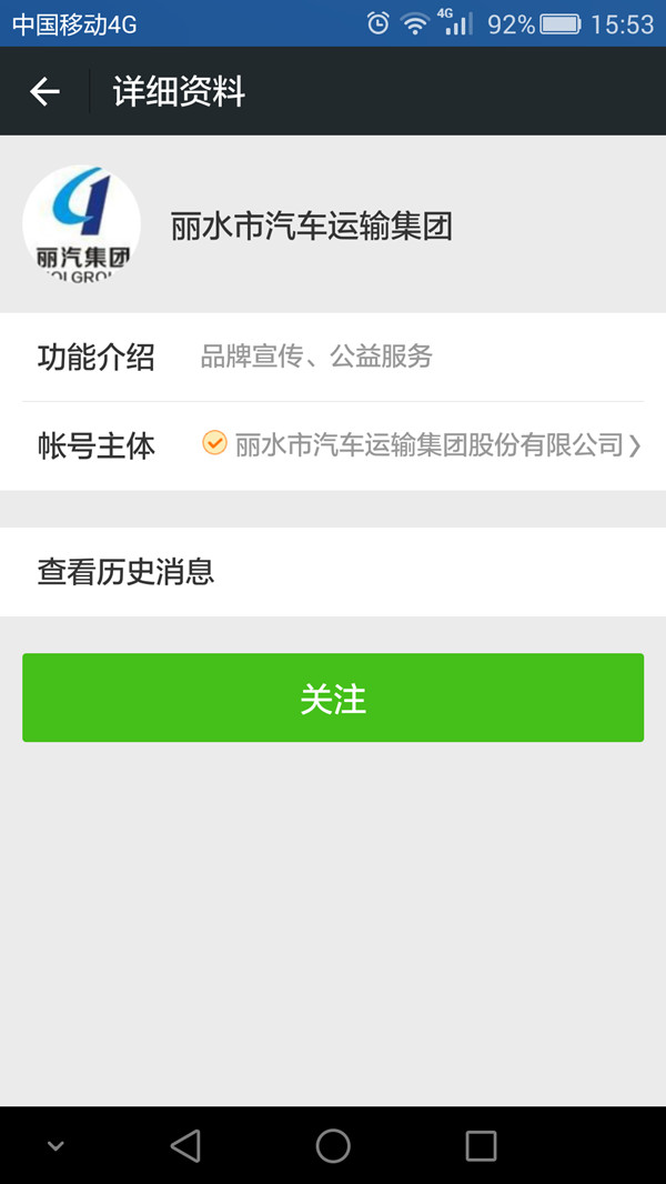 (1)打開微信,搜索添加“麗水市汽車運(yùn)輸集團(tuán)”微信公眾號(hào)或直接掃取二維碼,點(diǎn)擊關(guān)注。
