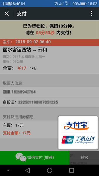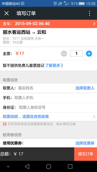 (4)點(diǎn)擊選擇需乘坐的班次,進(jìn)入填寫頁面,填寫取票人姓名、手機(jī)號(hào)碼及身份證。