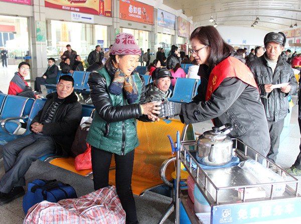 服務班的陳燕早早的推著服務車在候車室服務,為春運第一天踏上回家旅途的人們免費送上一杯杯熱氣騰騰的開水。陳燕說,為旅客服務是她的本職工作,農民工兄弟們在外工作了一年才回一趟家,她和姐妹們要盡自己所能,為他們提供最優(yōu)質的服務。服務班已備好了生姜茶,隨著氣溫的下降,姐妹們將會推車送姜茶服務,為他們回家的途中送上一抹溫暖。