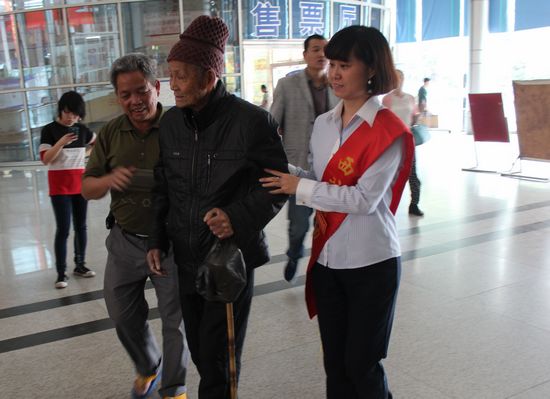 4月30日下午15:30時分,一位八十多歲的老人在五十多歲的兒子攙扶下,拄著拐杖顫顫悠悠的來到客運西站,準(zhǔn)備乘車回慶元老家休養(yǎng)。服務(wù)班工作人員李愛秧眼捷手快,立刻迎上前幫扶。