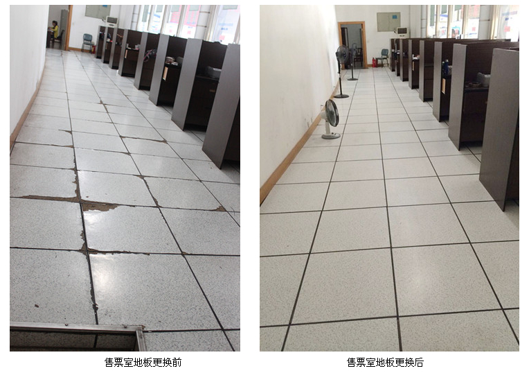 客運西站主樓一層售票室和消防監(jiān)控室的防靜電地板因使用多年,破損嚴(yán)重,影響了西站整體的美觀。為了保持西站良好的窗口形象和符合創(chuàng)建國家衛(wèi)生城市的要求,近日,西站對售票室和消防監(jiān)控室的防靜電地板進(jìn)行更新。