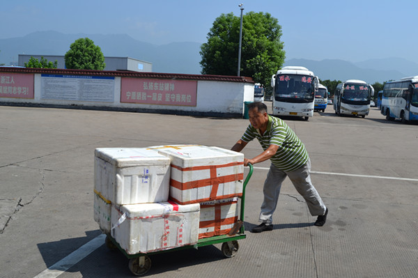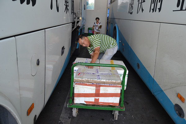 說話間,一輛班車緩緩駛?cè)胲囌尽T谙驴蛥^(qū)等候的江永貴和同班的胡瑞華快速地打開車輛行李倉?!耙患?、兩件、三件、四件……”江永貴一邊念著數(shù)字一邊熟練地搬著貨物,一件件貨物在他們手上快速頻繁地拿起、放下。雖然揮汗如雨,但規(guī)范操作程序卻絲毫不受影響:仔細(xì)核對貨號、件數(shù)、 到達(dá)站點、駕駛員簽名…… ,對精密電子設(shè)備、易碎物品、海鮮等 ,他們總是不忘給予特殊的“關(guān)照”。這看似簡單機(jī)械,沒有技術(shù)含量的工作,卻需要莫大的毅力和耐心。車艙狹小,為適應(yīng)卸貨碼貨的需要,他們不停的變換姿勢,時而曲膝半蹲,時而探身彎腰,片刻,他們剛剛有點晾干的工作服又一次被汗水浸透了。