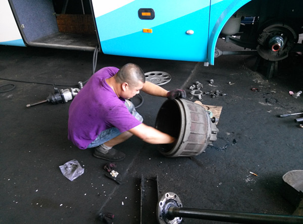 客長(zhǎng)運(yùn)分公司維修車間,何軍海師傅正在緊張的修理汽車輪轂