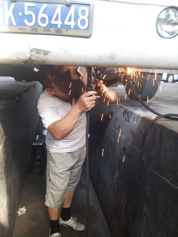 客長(zhǎng)運(yùn)分公司修理工陳勇軍師傅正在進(jìn)行電焊作業(yè),灼眼的火星、淺藍(lán)的焊霧、嗆鼻的氣味彌漫維修車間