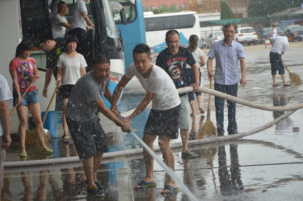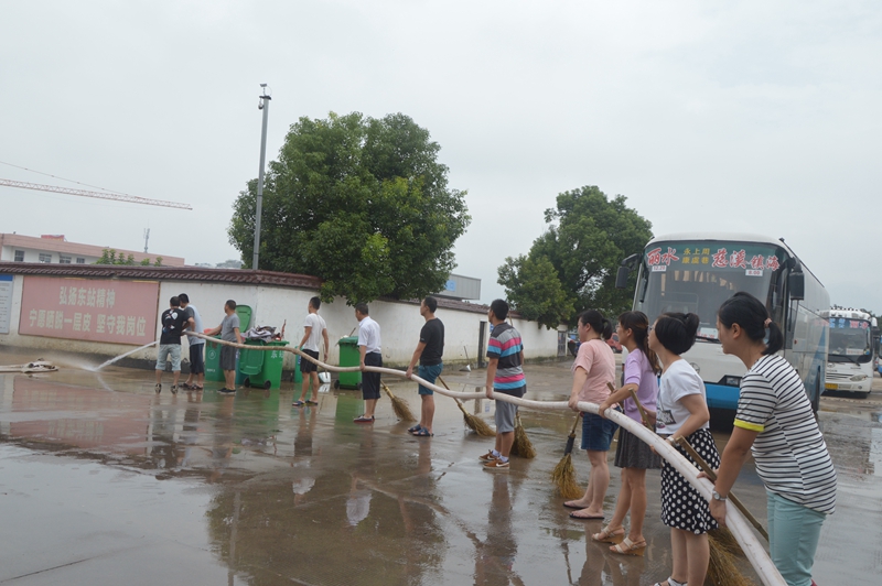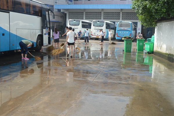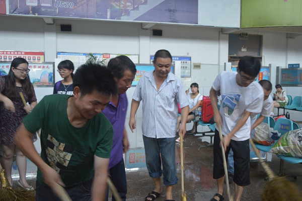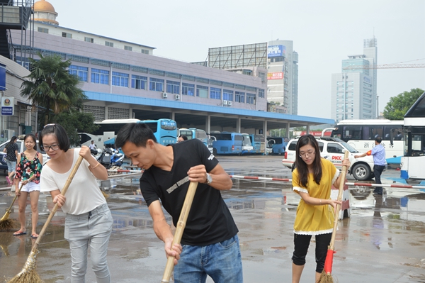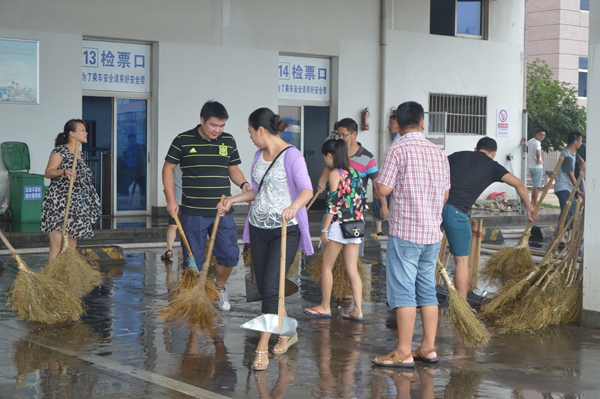 旅游集散的青年隊(duì)伍來(lái)了,經(jīng)理葉劍飛和員工們一道正起勁地沖洗著候車室。