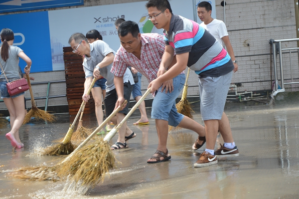 南明文化傳媒的兄弟來(lái)了,經(jīng)理馬偉文為大家運(yùn)來(lái)了清掃站場(chǎng)的掃帚等工具。分發(fā)完工具后,大家馬上投入到救援當(dāng)中。