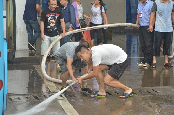 西站救援隊(duì)伍來(lái)了,他們?cè)诮?jīng)理雷文華的帶領(lǐng)下,最早趕赴東站站場(chǎng),保衛(wèi)稽查員們嫻熟地操起消防帶,通過(guò)水槍沖洗淤泥。