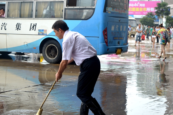 東站的站場(chǎng)上,到處是兄弟單位救援人員的身影。有的參與到電力搶修、有的維護(hù)秩序、有的引乘導(dǎo)乘,大部分人參與到清掃站場(chǎng)中:前面人員拉起消防帶、把好水槍,沖到哪片淤泥,后面人員就掄起掃把跟到哪,快速把污泥、污水沖掃到陰溝里,配合得恰當(dāng)好處。烈日下,個(gè)個(gè)揮汗如雨,濕透了衣服,有的赤著腳,有的索性光著膀子。水槍沖到哪,掃到哪,身后留下一片片潔凈的場(chǎng)地。