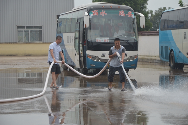 長(zhǎng)運(yùn)公司修理車間、調(diào)度室等昨天也受到了重創(chuàng)。一大早,修理工師傅們?cè)缫涯闷鹚畼?,打掃修理車間;員工們開(kāi)始沖洗辦公場(chǎng)地。
