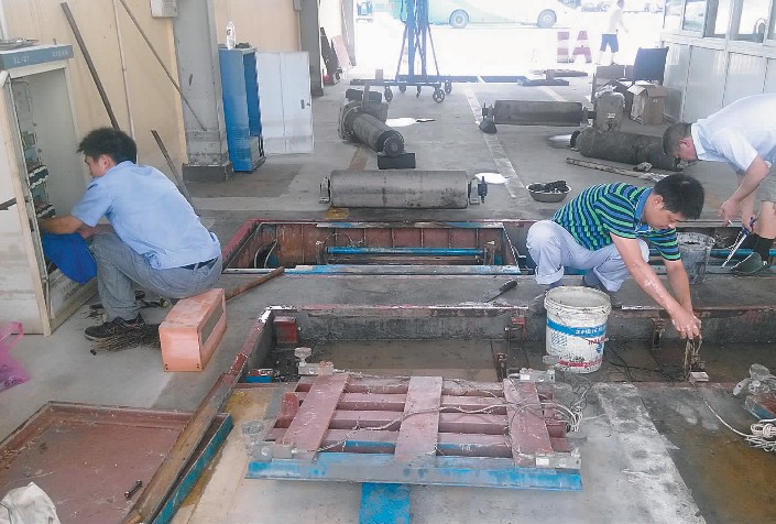 修理車間是客長(zhǎng)運(yùn)分公司的重災(zāi)區(qū),洪水過(guò)后留下垃圾、淤泥一大片;8 條地溝全泡在污水里,其中一條自動(dòng)檢測(cè)線因長(zhǎng)時(shí)間受洪水浸泡,受損嚴(yán)重。車間負(fù)責(zé)人快速找來(lái)電泵,先把地溝里的水抽去。為盡快恢復(fù)災(zāi)后生產(chǎn),保證車輛安全運(yùn)行,客長(zhǎng)運(yùn)分公司專門(mén)成立了搶修門(mén)檢線應(yīng)急小組,由王斌副經(jīng)理負(fù)責(zé); 檢測(cè)站派出金軍輝和金曉東兩位技術(shù)人員幫忙搶修; 集團(tuán)公司生產(chǎn)經(jīng)營(yíng)部經(jīng)理江少華也在做技術(shù)指導(dǎo)。大家不間斷工作十余小時(shí),終于在晚上 7:00 左右,手工檢測(cè)線搶修完畢,恢復(fù)正常工作。