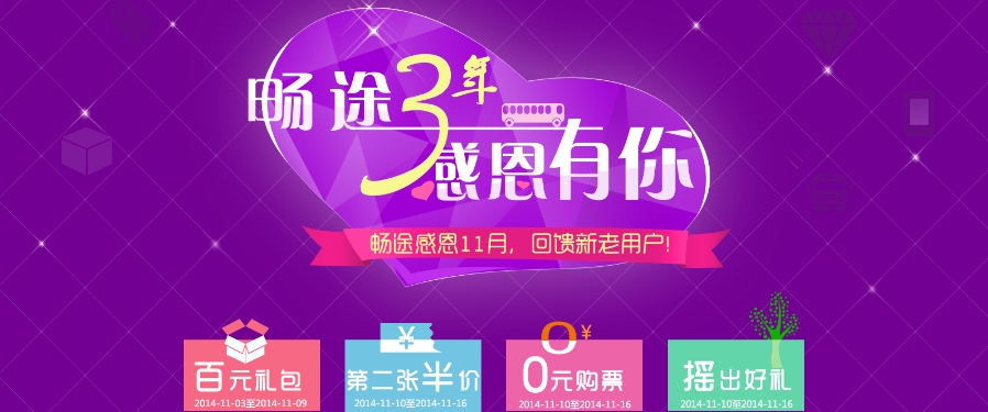為了慶祝暢途網(wǎng)成立3周年,在11月份,暢途網(wǎng)推出了一整月的活動(dòng),有:11.3-11.9購(gòu)票送百元禮包,11.10-11.16第二張票半價(jià),11.17-11.23 0元購(gòu)票,11.24-11.30搖錢(qián)樹(shù)送好禮。活動(dòng)多多,優(yōu)惠多多,讓大家在輕松享受購(gòu)票的同時(shí),帶給大家更多的實(shí)惠與樂(lè)趣!