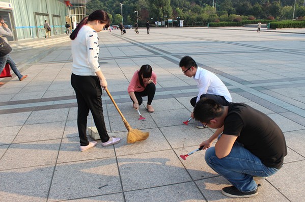 鏟刀、清潔刷、掃把、水管……清潔工具一一分配到手中之后,大家便熱火朝天的干起來。雖已入秋,但午后的太陽依然刺眼,沒一會兒,大家都開始冒汗,但誰也沒停下手中的勞動,依舊頂著太陽蹲在地上鏟口香糖或是奮力地洗刷地面。