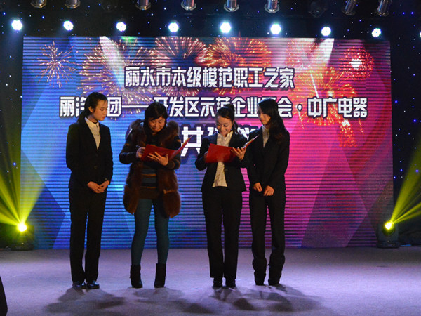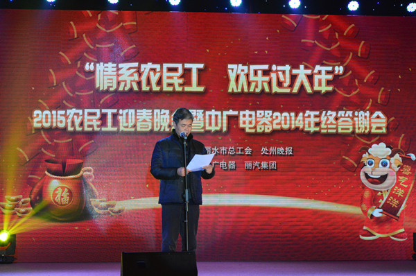 1月31日晚,由麗水市總工會(huì)和處州晚報(bào)主辦、中廣電器和麗汽集團(tuán)承辦的“情系農(nóng)民工歡樂過大年2015農(nóng)民工迎春晚會(huì)暨中廣電器2014年終答謝晚會(huì)”在開發(fā)區(qū)中廣電器有限公司舉行,會(huì)上,麗汽集團(tuán)和中廣電器還舉行了市本級模范職工之家結(jié)親共建儀式,兩家企業(yè)關(guān)愛職工、職工熱愛企業(yè)的典范決心通過“結(jié)對幫帶”,為市本級工會(huì)工作的發(fā)展增添更多的亮點(diǎn)和活力。