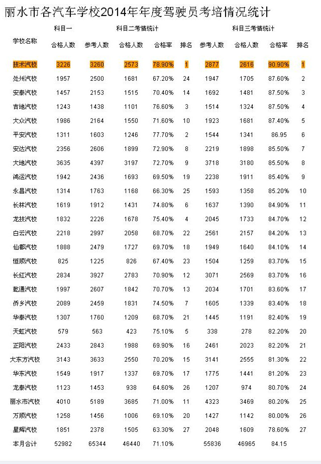 另?yè)?jù)“麗水市各汽車學(xué)校2014年年度駕駛員考培情況統(tǒng)計(jì)”數(shù)據(jù)顯示,麗汽集團(tuán)汽校2014年年度駕駛員考培科目二、科目三的考試合格率分別達(dá)到78.90%和90.90%,兩項(xiàng)排名均居全市第一。