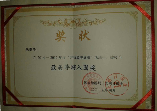 朱勇華是麗水市首屆金牌導(dǎo)游,麗水市首批五養(yǎng)技能大師,并曾榮獲金牌導(dǎo)游大賽“最佳才華獎”、2011年“古堰畫鄉(xiāng)”杯導(dǎo)游技能大賽二等獎。
