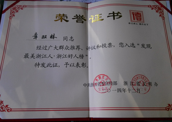 “發(fā)現(xiàn)最美浙江人--浙江好人榜”推薦評選活動由省委宣傳部、省文明辦聯(lián)合開展,每月推薦評選一次,旨在為大力培育和弘揚社會主義核心價值觀,積極普及和踐行當代浙江人共同價值觀,進一步深化“發(fā)現(xiàn)‘最美浙江人’、爭做‘最美浙江人’”主題宣傳實踐活動,健全和完善“浙江好人”選樹和培育機制,推動“最美”從“盆景”變成“風景”、從“風景”變?yōu)椤帮L尚”。推薦評選分為助人為樂類、見義勇為類、誠實守信類、敬業(yè)奉獻類和孝老愛親類五個類別。評選活動經(jīng)過網(wǎng)絡投票、群眾評議、專家評審等環(huán)節(jié),12月份共評選出25名浙江好人,章雙林入選見義勇為類浙江好人。
