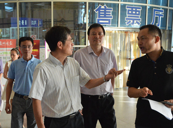 在客運西站,陳部長一行察看了售票大廳、候車室前廳等地方??吹绞燮贝髲d內(nèi)文明旅游引導(dǎo)員正在引導(dǎo)旅客有序排隊購票,文明旅游公益宣傳提示牌擺放整齊,兩處文明旅游標(biāo)語均按規(guī)定陳列醒目時,陳部長對西站的工作也給予了充分肯定。在進(jìn)一步了解情況后,陳部長對身邊的運管部門負(fù)責(zé)人說:“西站的問題不在站內(nèi),主要在出租車管理和黑車的打擊,運管部門要做好管理工作。”隨后與各部門負(fù)責(zé)人一起商議了出站口出租車管理措施、硬件改造等問題。