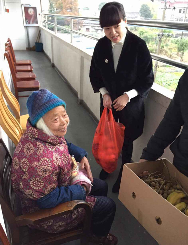 經(jīng)過20多分鐘的車程,下午3點(diǎn),我們的車子到達(dá)了靈山敬老院,因?yàn)槭孪嚷?lián)系,已經(jīng)有許多老人在門口等候我們。與在場的老人一一問候后,我們十余名團(tuán)員迅速分工,將帶來的水果和餅干等點(diǎn)心給不同樓層的老人送上,并帶上大家的祝福。我們的到來,使原本安靜的敬老院變得熱鬧,歡笑聲此起彼伏,我們陪著老人聊天,給他們送上熱騰騰的開水,將順手剝好的水果遞上。