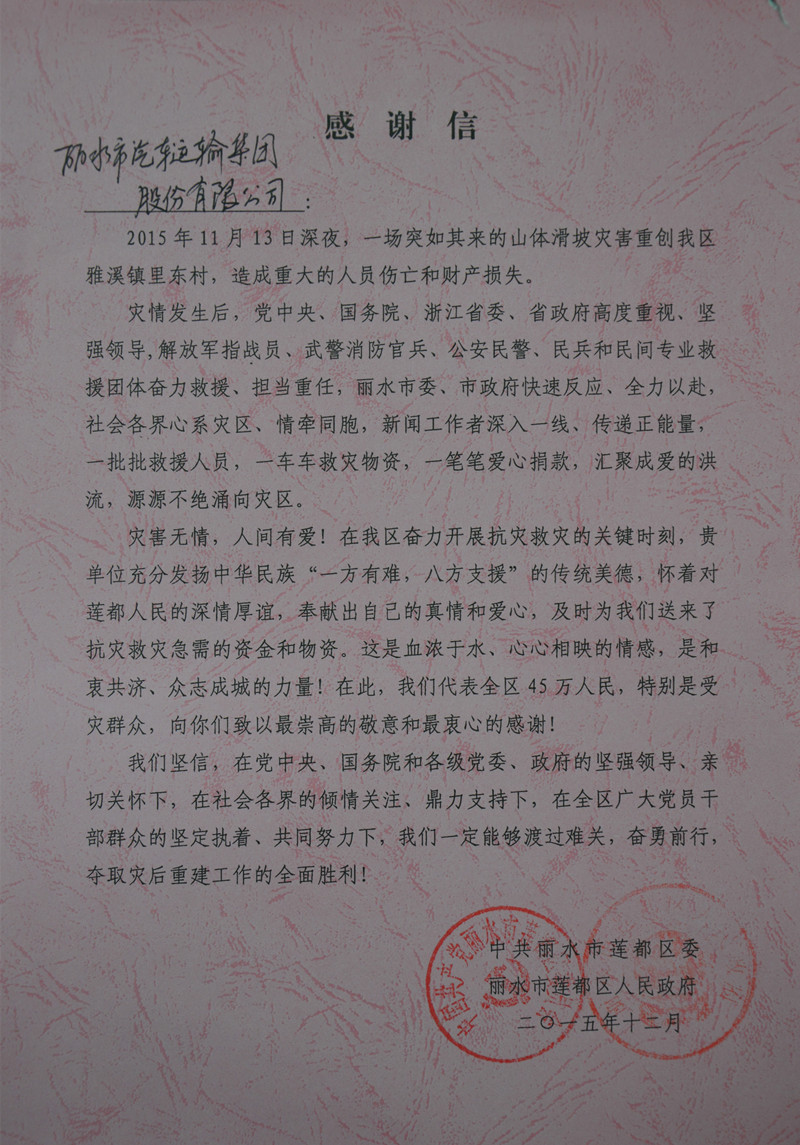 12月14日,集團(tuán)公司收到蓮都區(qū)委區(qū)政府送來的感謝信,感謝集團(tuán)公司在里東災(zāi)區(qū)救援工作中的奉獻(xiàn)。