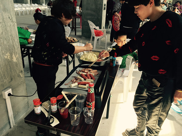 包水餃日常在家我們也經(jīng)常做,可是自己揉面搟餃子皮對于很多人來說還是第一次。還好我們組有幾個經(jīng)驗的姐姐,在她們的指導下大家分工合做,有的揉面有的搟餃子皮有的負責包。由于我們當中還有很多是初學者,搟出來的餃子皮大小厚度各有不同,包的餃子更是融入了南北方不同手法,最后包出來的餃子形狀各異,色彩斑斕。但是自己的勞動成果味道總是特別的好。這邊包餃子的同事們正包的起勁,那邊燒烤的同事也沒閑著不停為我們送上他們烤的烤串品嘗。燒烤的時候也是小插曲不斷,由于功率過大先是把同事家里帶來的插座燒了,后來又跳閘沒電,所幸都一一解決了,我們才能吃上色香味俱全的燒串。