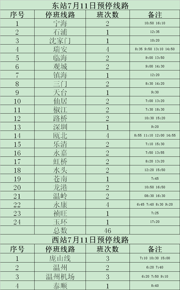 因臺(tái)風(fēng)“燦鴻”影響,為確保乘客安全,麗汽集團(tuán)客運(yùn)東、西兩站暫時(shí)停開(kāi)下列班車,具體復(fù)班時(shí)間視11日臺(tái)風(fēng)情況再行公告。