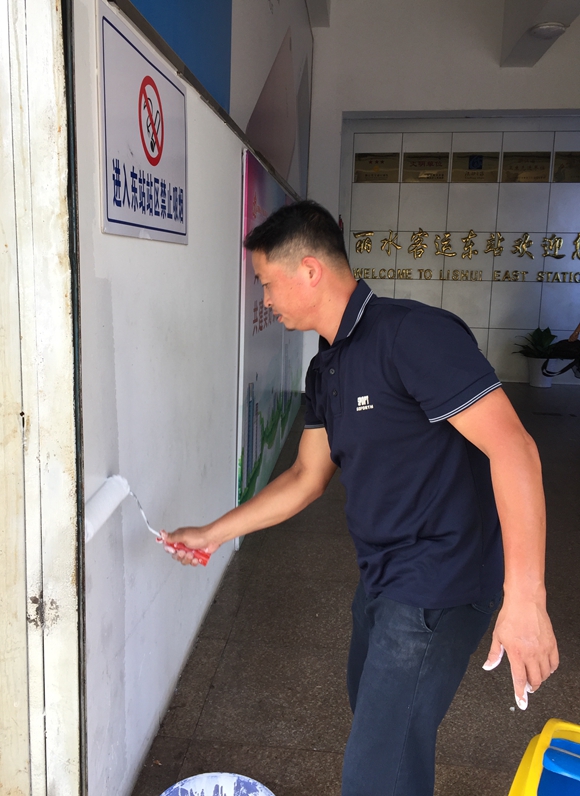 東站志愿者隊(duì)售票廳、候車廳、發(fā)車區(qū)墻壁進(jìn)行刷白