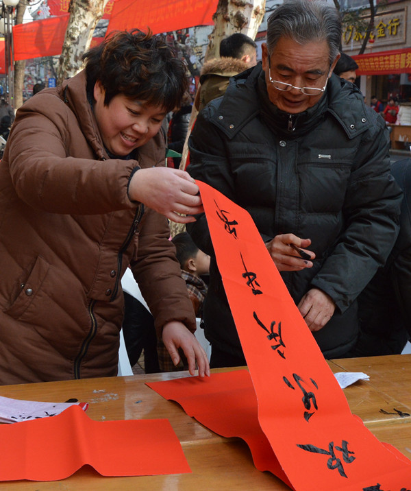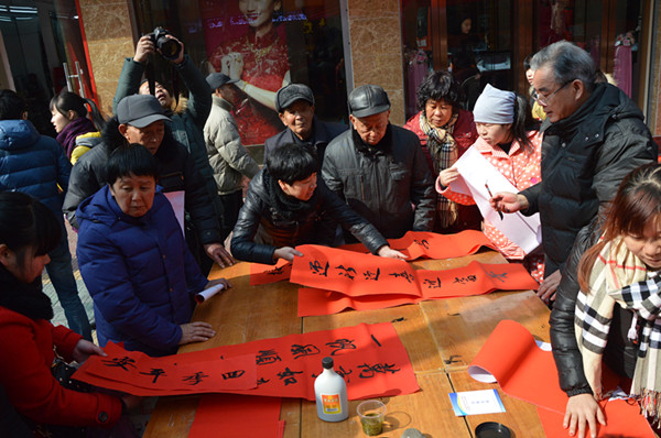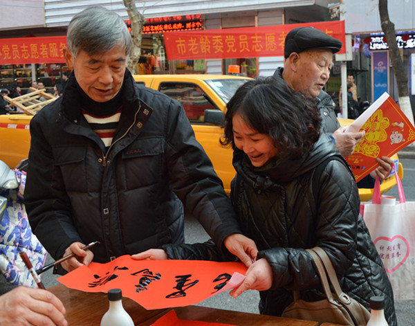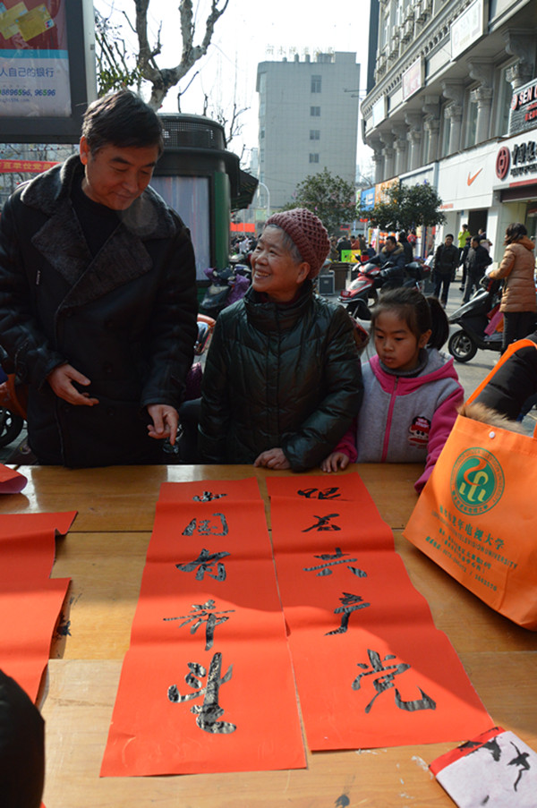 幾張小桌子拼成的簡易書案更是黨員一條街上靚麗的風(fēng)景。三位老同志一落筆,書案旁邊一下子就圍滿了人,大家一邊排隊(duì)等候著“墨寶”,一邊點(diǎn)贊著三位老師的書法。葉女士高興地說:“手寫的春聯(lián)不僅更有年味,而且還是在弘揚(yáng)中國的書法藝術(shù)。中國傳統(tǒng)的年俗文化,現(xiàn)在已經(jīng)越來越難得了。”一對雙胞胎寶寶的父母恰巧推著嬰兒車從服務(wù)點(diǎn)前經(jīng)過,趕緊請老師寫下“開心寶貝”四個字,還說是給孩子倆最珍貴的新年禮物。