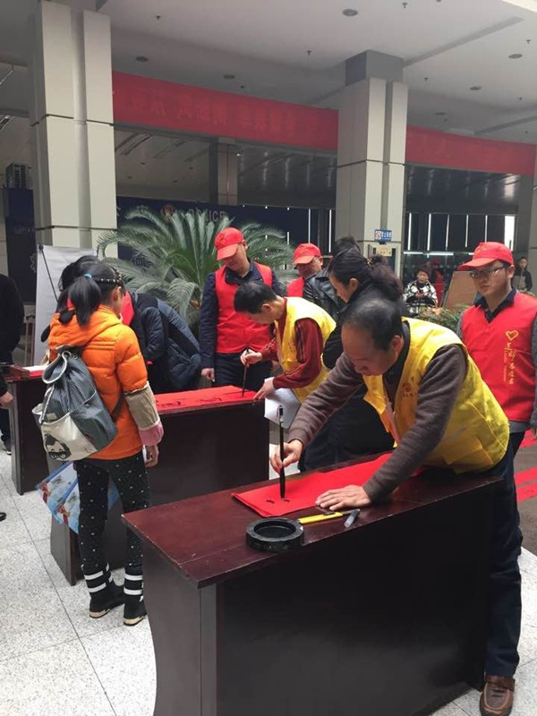 總工會(huì)的志愿服務(wù)隊(duì)伍還帶來了“志愿者書寫春聯(lián)”,現(xiàn)場(chǎng)寫就的200多幅春聯(lián)很快就被乘客們領(lǐng)取一空。