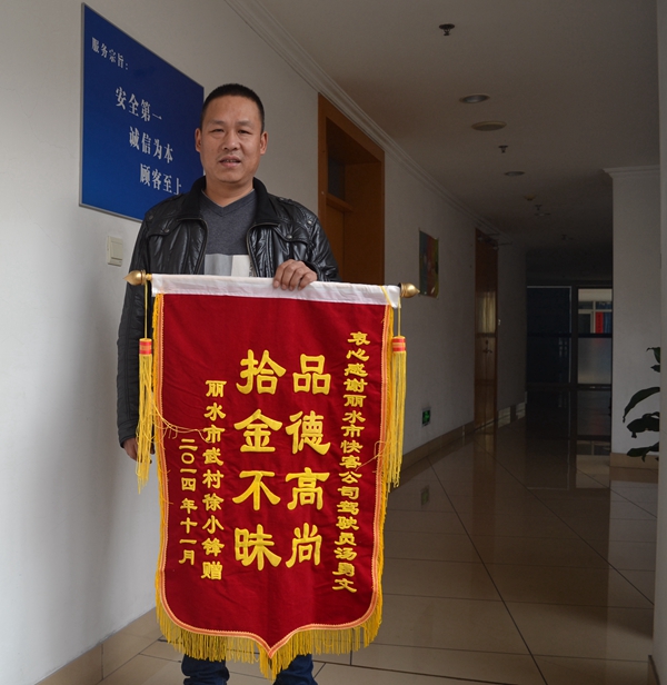 “拾金不昧,本不是新聞了,但輪到自己親身體驗(yàn)這種社會(huì)正能量的日益增長(zhǎng),還是讓我倍感欣喜。”10月16日傍晚,在江蘇開(kāi)超市的徐先生手拿錦旗,來(lái)到快客分公司車隊(duì),對(duì)駕駛員湯勇文拾金不昧的精神予以表?yè)P(yáng)。他說(shuō),11月14日他乘坐18:45從杭州回麗水的班車,一時(shí)大意把隨身的錢包遺失了,里面有五千多元的現(xiàn)金和若干張銀行卡。次日,當(dāng)他焦急萬(wàn)分來(lái)到快客車隊(duì)時(shí),卻發(fā)現(xiàn)駕駛員湯勇文正拿著妥善保管的皮夾等著他?!?br/> 據(jù)了解,當(dāng)天晚上11時(shí)左右,駕駛員湯勇文在做下客后的檢查時(shí),發(fā)現(xiàn)一只皮夾被旅客遺落在車廂通道上,他打開(kāi)皮夾一看,足有好幾千元的現(xiàn)金和各類卡,他心想,這么重要的東西旅客一定會(huì)再回來(lái)找的,他把情況向值班隊(duì)長(zhǎng)報(bào)告后,又在下客區(qū)足足等了十余分鐘,也不見(jiàn)旅客回來(lái)找。于是,他將皮夾保管完好等著歸還旅客,也就有了開(kāi)頭一幕。